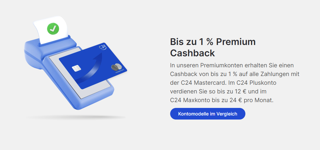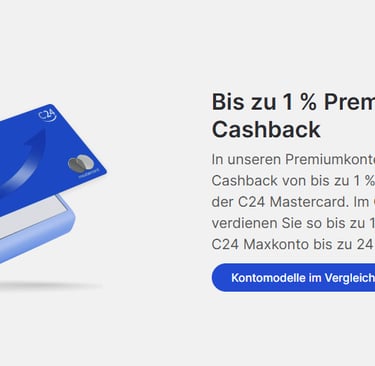 Cashback: Erhalte bis zu 1 % bei jeder Zahlung mit der C24 Mastercard und sammle bis zu 24 € pro Monat. Erhalte mehr Cashback bei weiteren Aktions-Partnern bis zu 10 % Cashback.