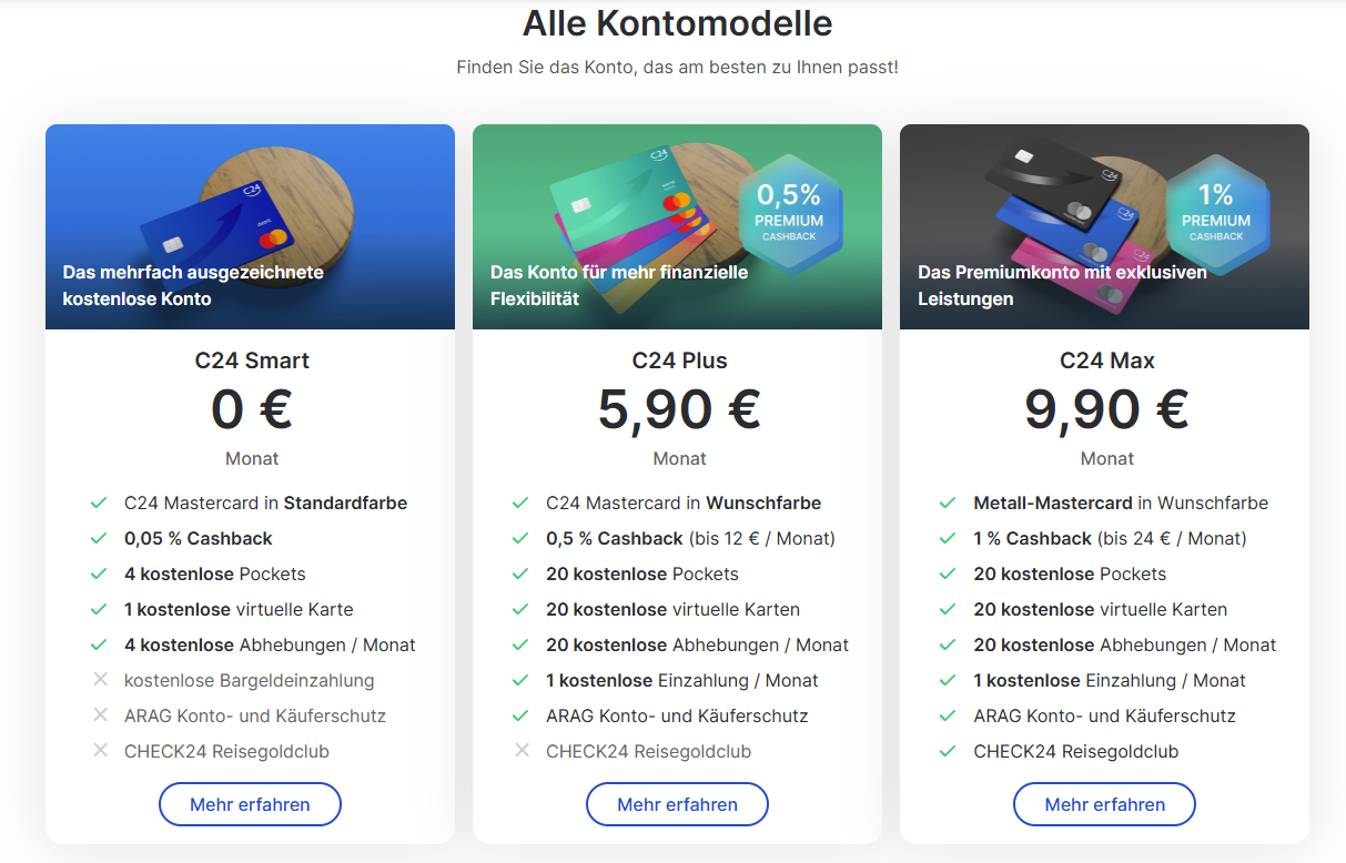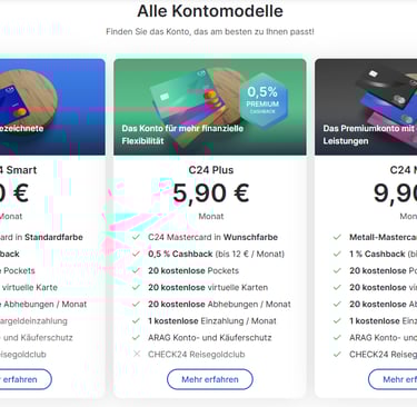 Im Girokonto-Vergleich der Stiftung Warentest ist das kostenfreie Smartkonto der C24 Bank eins von nur zehn Gratiskonten „ohne Wenn und Aber“. Neben der kostenlosen Kontoführung inklusive Mastercard bietet das Smartkonto bis zu vier Pockets und eine gebührenfreie Girocard bei aktiver Nutzung des Kontos. Diese setzt monatlich mindestens zwei Lastschriften voraus.