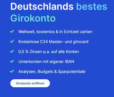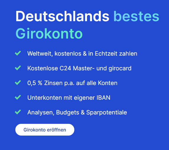 Unabhängig vom Tagesgeldkonto bietet die C24 Bank weiterhin 0,50 Prozent Zinsen auf dem Girokonto. Geldeingänge auf das Girokonto werden sofort verzinst und stehen zur Deckung der monatlichen Ausgaben zur Verfügung, z. B. per Lastschrift oder Kartenzahlung.